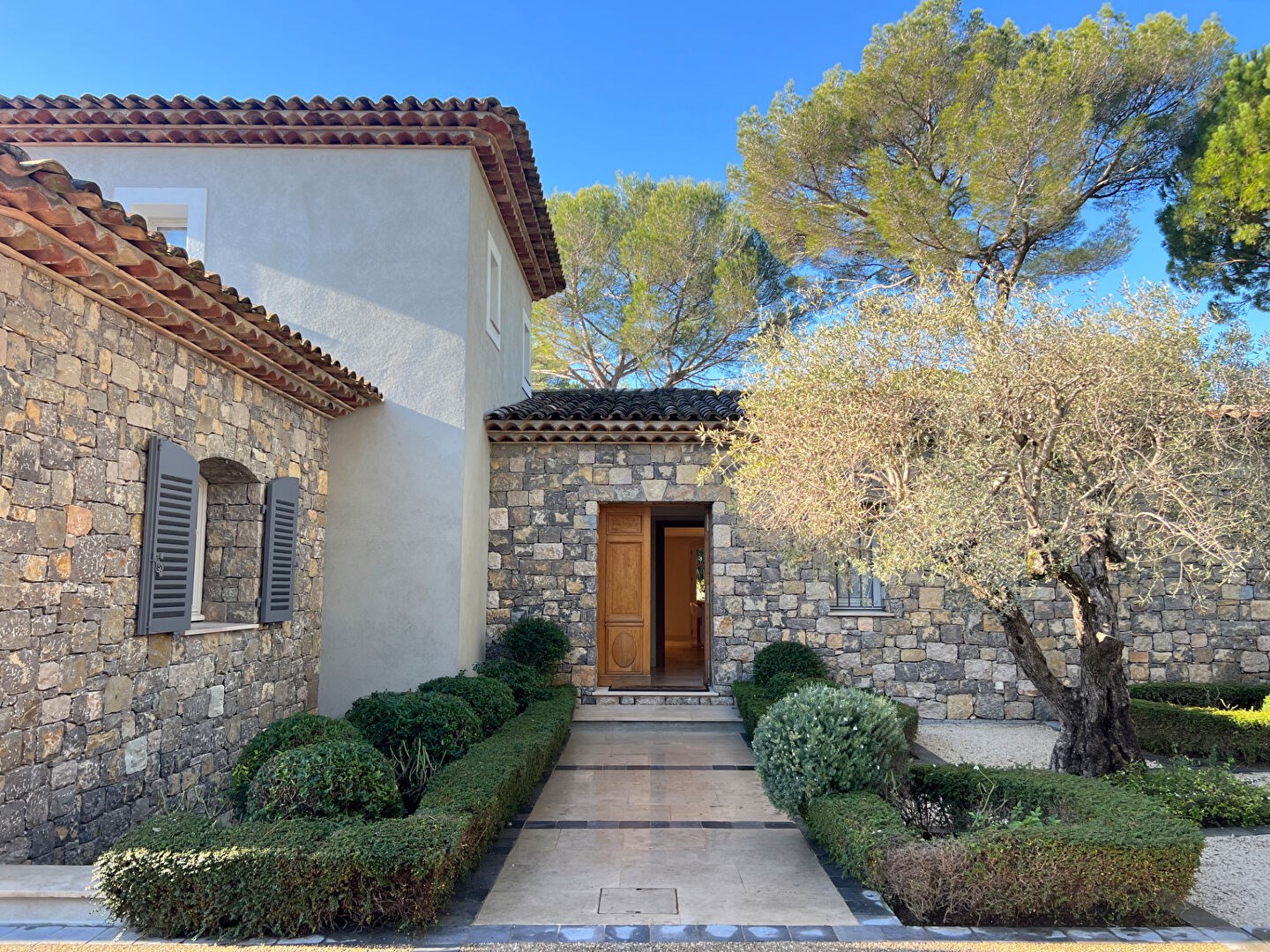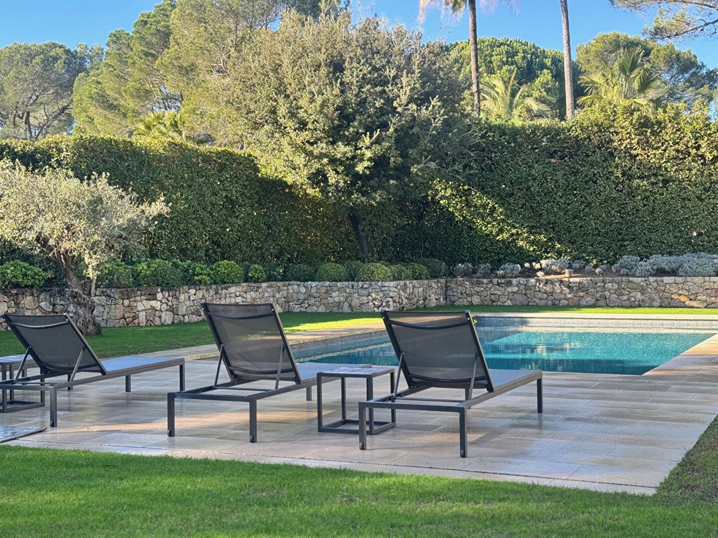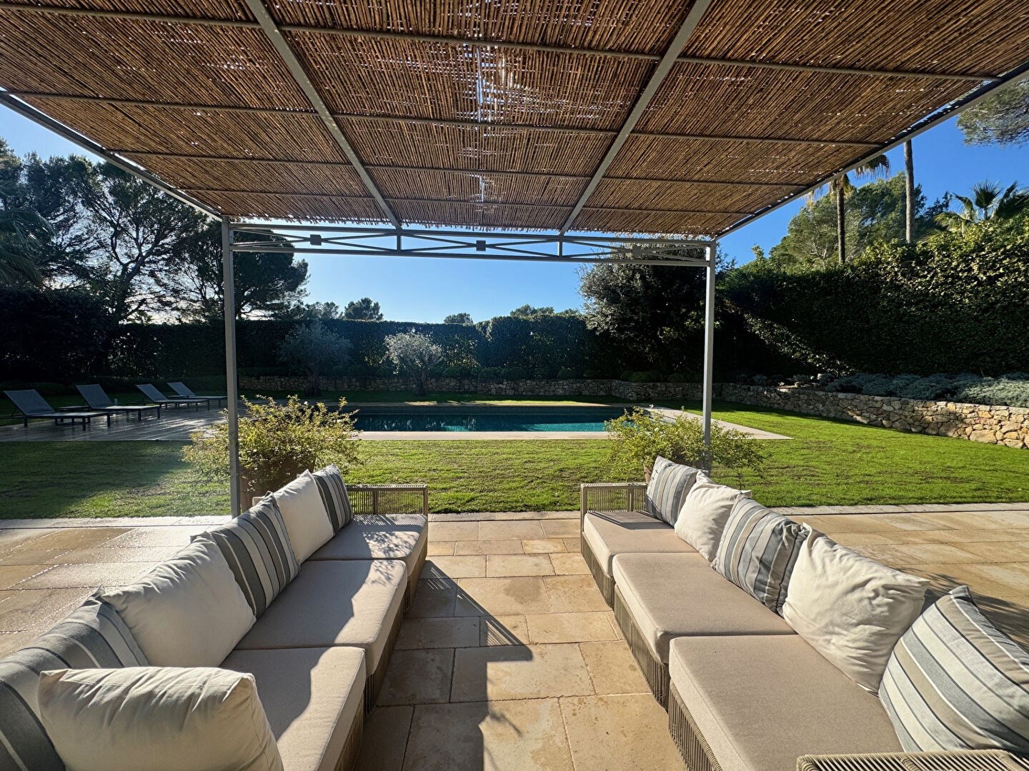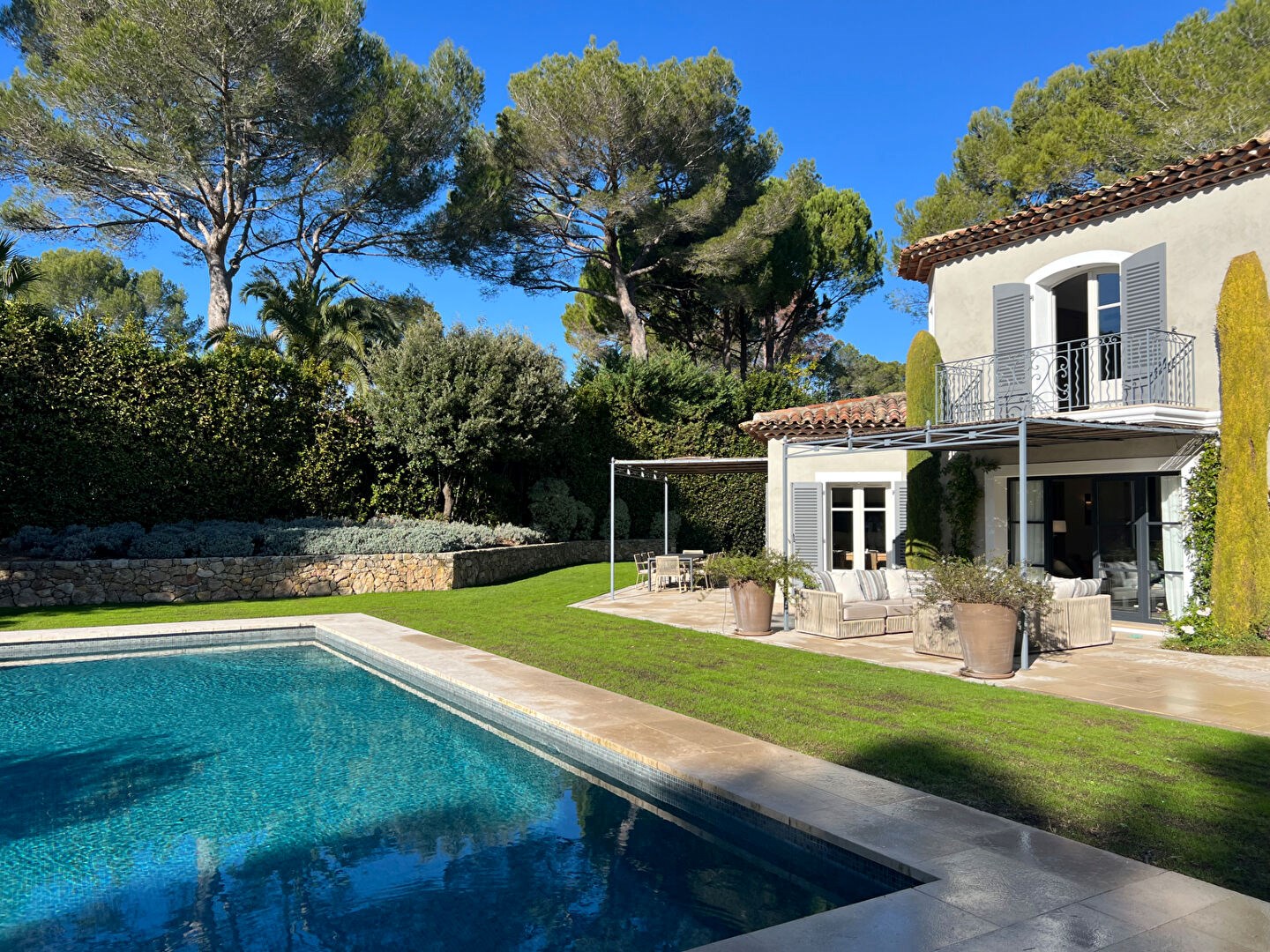 Idéalement placée à proximité des golfs et de l'étang de Mougins, cette propriété offre un cadre de vie d'exception, alliant design, confort et sérénité.