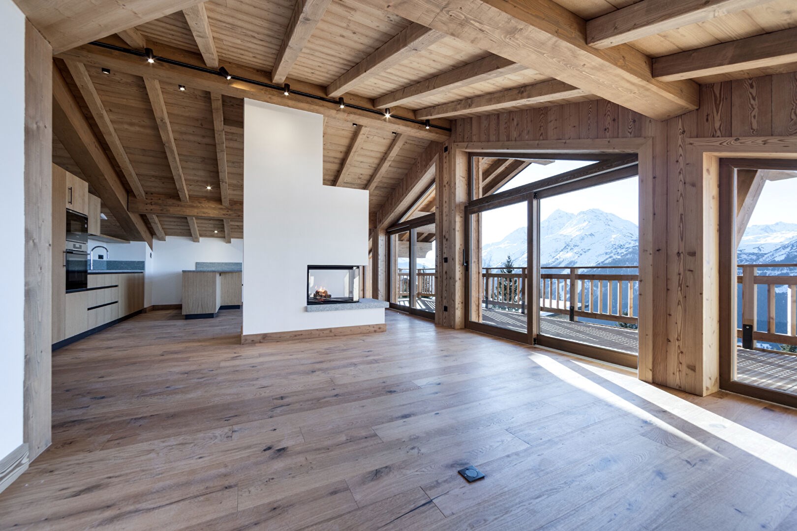 Au coeur de la station de La Rosière, Le Chalet Valentine vous propose à la vente un appartement T5 neuf de 129 m² (plus 12 m² sous 1,80 m) situé au dernier étage d'une petite copropriété. Livré prêt à être aménagé, il bénéficie de prestations haut de gamme et d'une luminosité optimale grâce à son exposition plein sud. L'appartement se compose d'une entrée, d'une cuisine ouverte sur un spacieux séjour sous une belle charpente, où la cheminée crée une ambiance chaleureuse idéale pour de belles soirées d'hiver. Il comprend également quatre chambres doubles, quatre salles d'eau et trois WC, offrant ainsi un confort parfait pour toute la famille. Une grande terrasse plein sud permet de profiter d'une vue panoramique sur les montagnes environnantes. Le bien inclut trois places de parking couvertes, une cave et un casier à skis, alliant praticité et confort pour vos séjours à la montagne. La récupération de TVA est possible. Copropriété de 7 lots ().