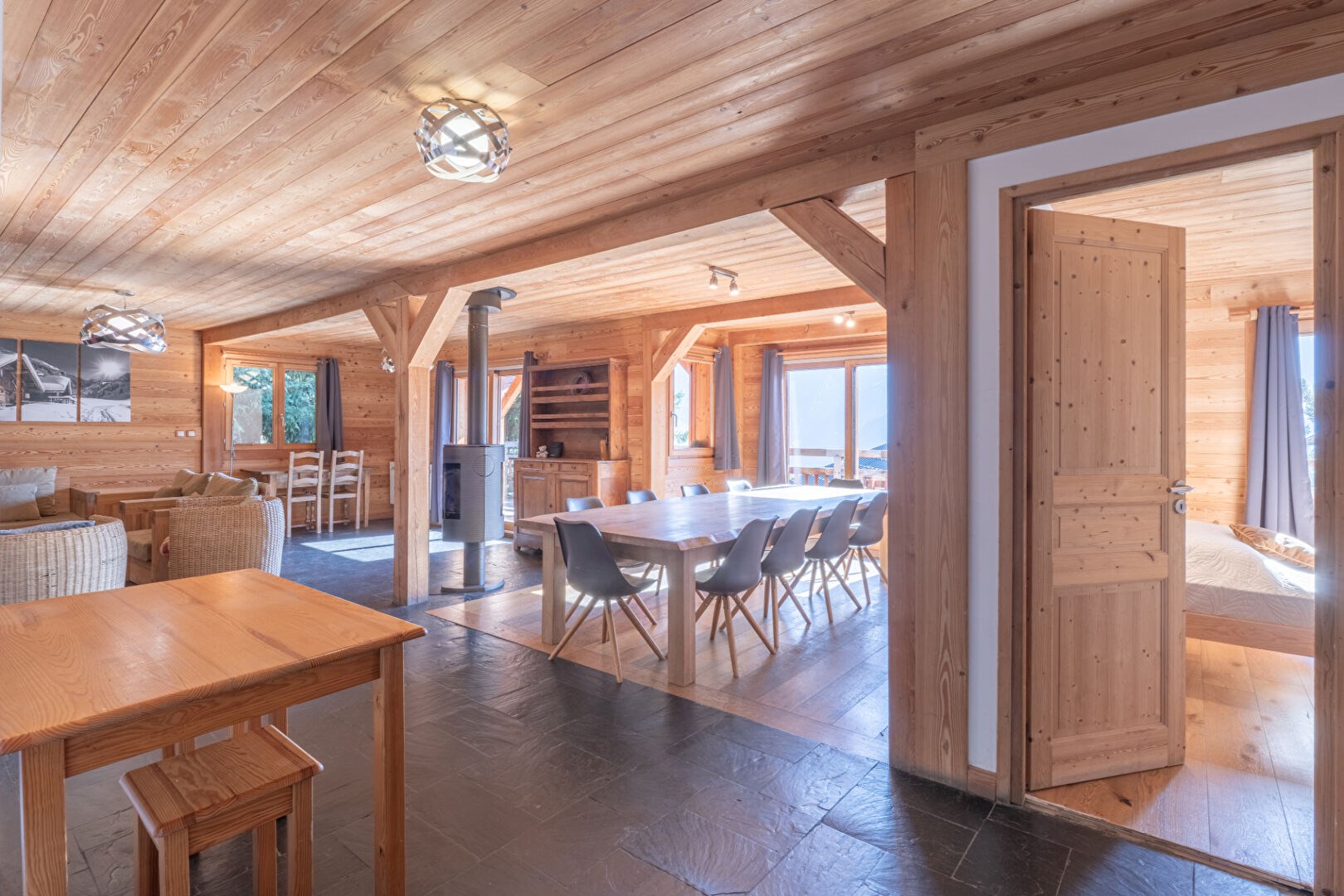 Nichée dans un environnement paisible, cette superbe construction Bayrou séduit par son authenticité, ses volumes généreux et sa vue dégagée sur les sommets. Édifié sur trois niveaux, le chalet offre 245 m² de surface totale, parfaitement agencés pour accueillir grande famille et amis dans un cadre chaleureux. Au niveau principal, une vaste pièce de vie réunit cuisine ouverte, salle à manger et salon avec poêle. L'ensemble s'ouvre sur une terrasse plein sud, idéale pour profiter du soleil et admirer la montagne. Une suite parentale complète ce niveau, alliant confort et intimité. Au niveau inférieur, quatre grandes chambres s'ouvrent directement sur le jardin, créant une atmosphère intime et reposante. Vous y trouverez également une buanderie et un espace détente avec sauna, parfait pour vos retours de ski ou randonnées. Au dernier niveau, deux grands dortoirs supplémentaires offrent une belle capacité d'accueil pour les enfants ou les invités. Un garage fermé de plus de 30 m² vient compléter ce bien rare.
