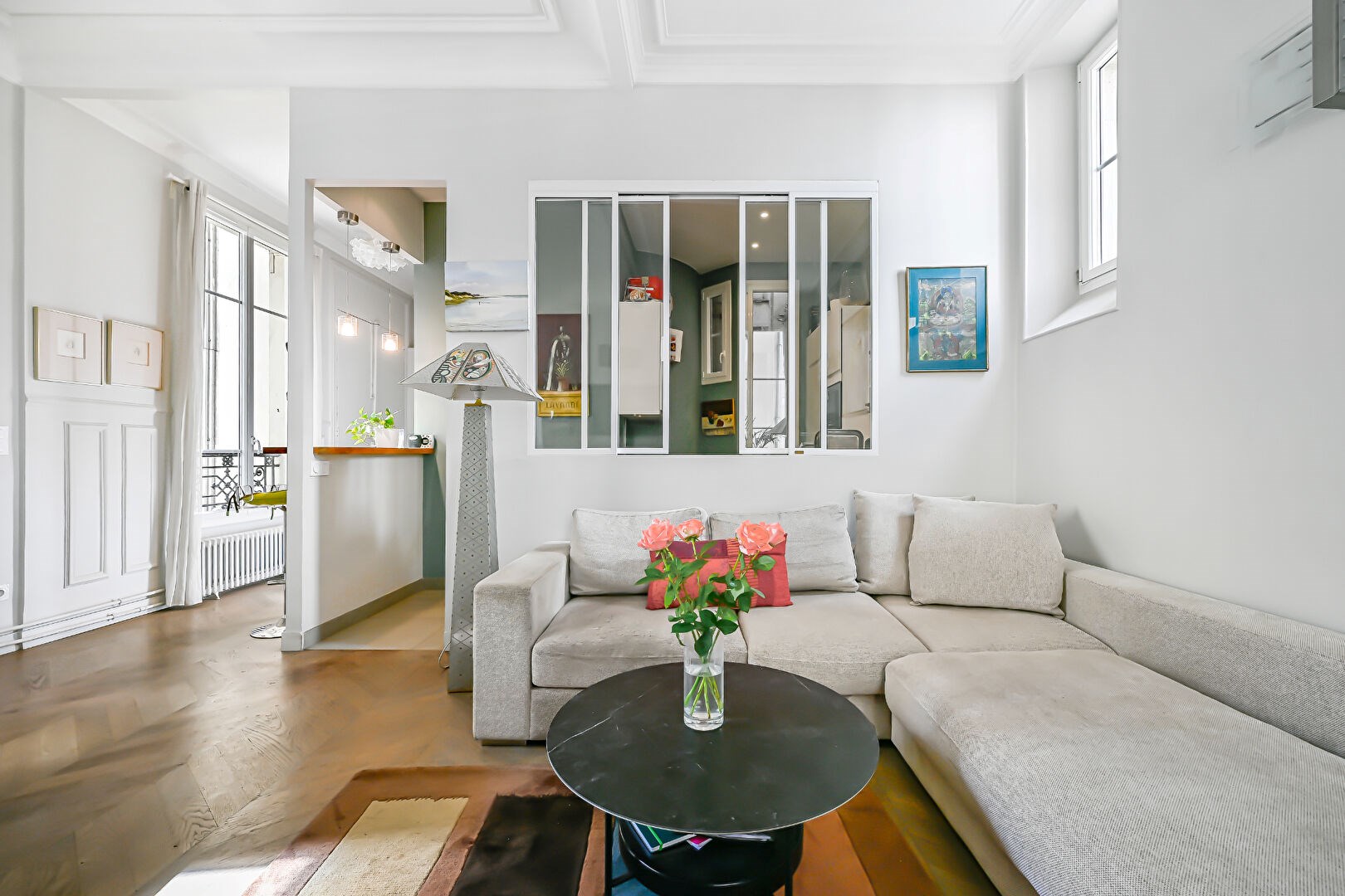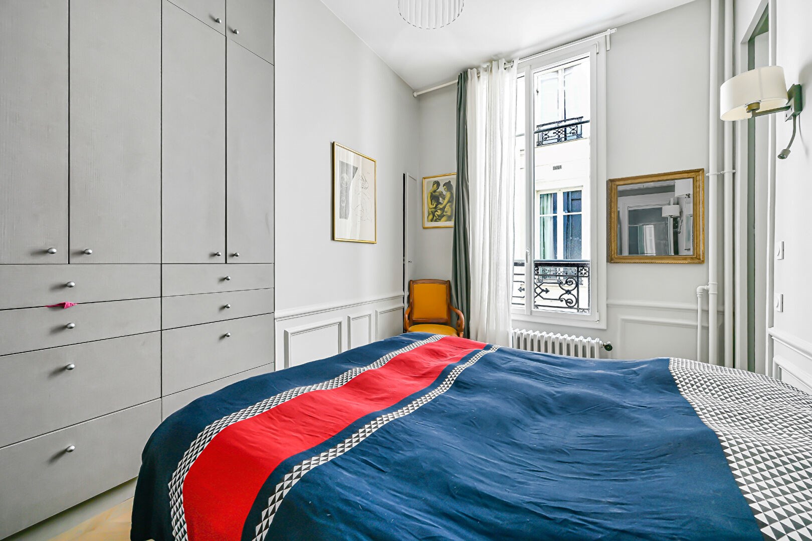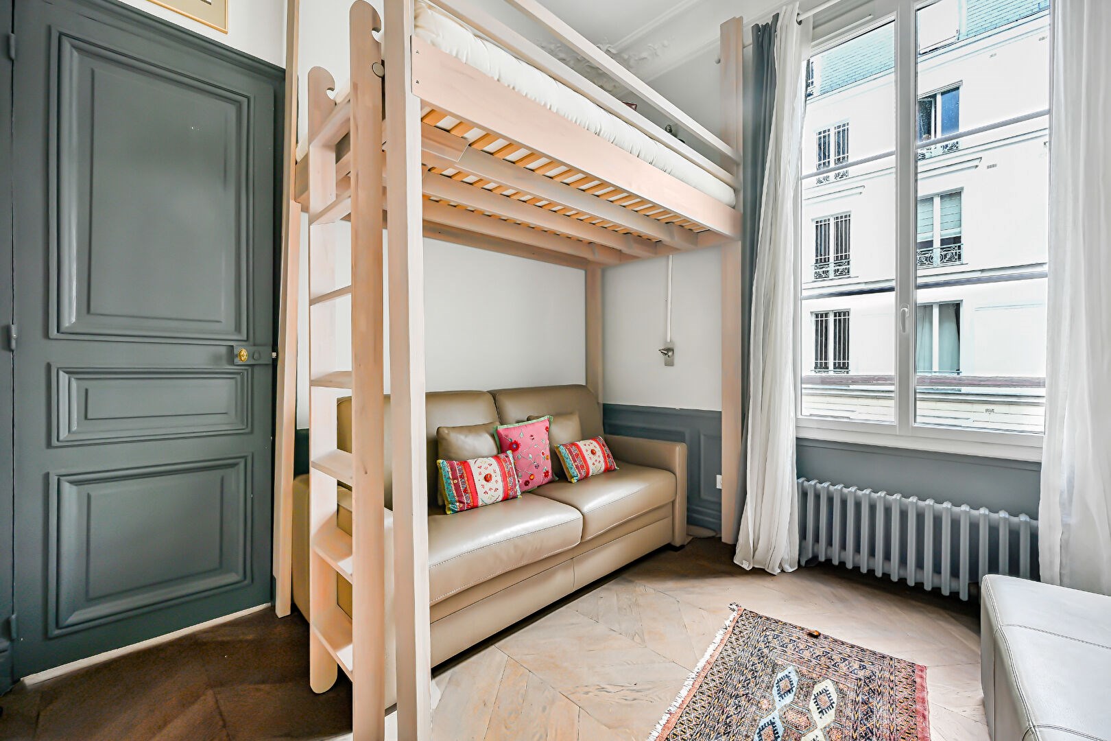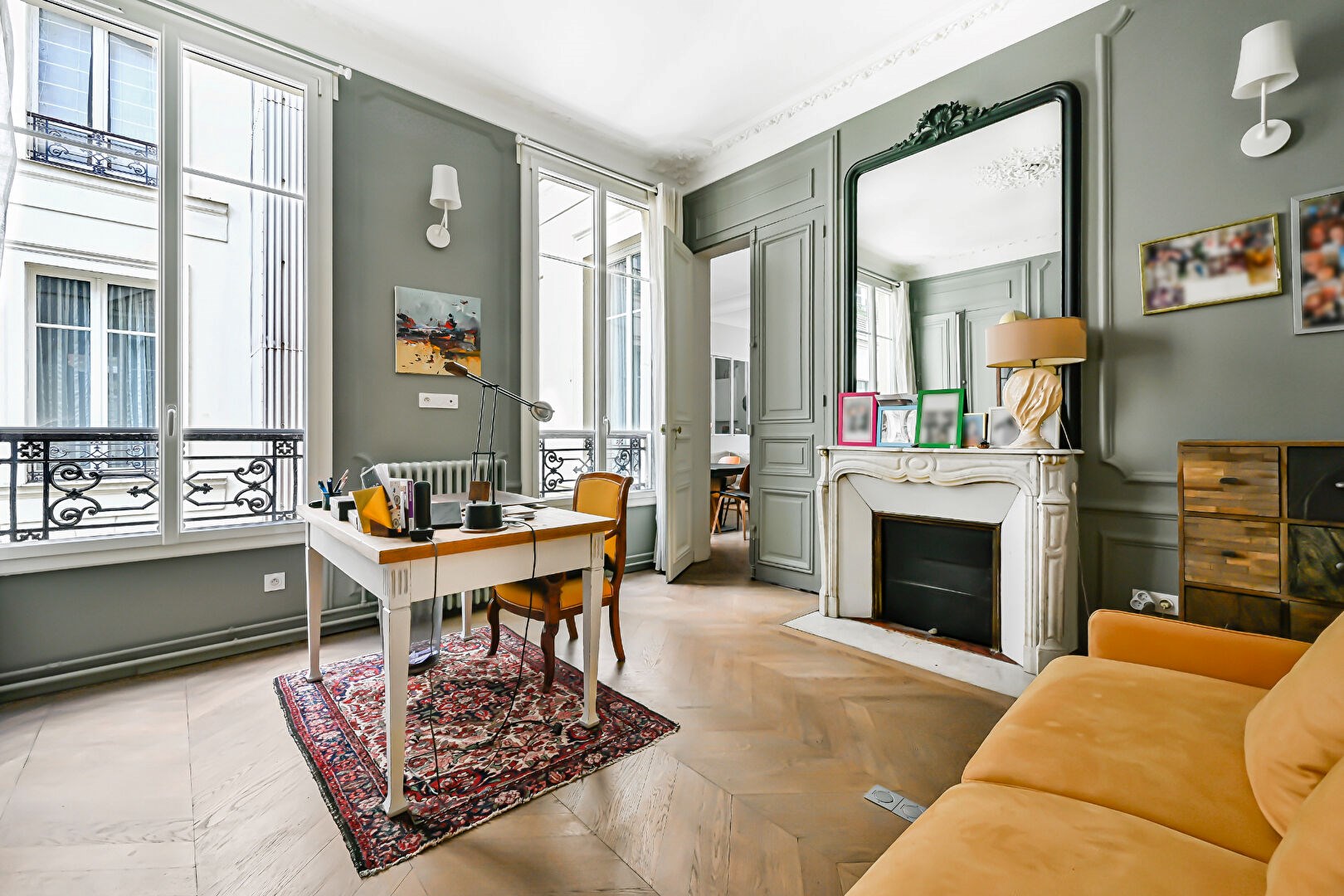 Parquet point de Hongrie, 3, 30 mètres de hauteur sous plafond. Charme de l'ancien (moulures, cheminée). Nombreux rangements sur mesure.