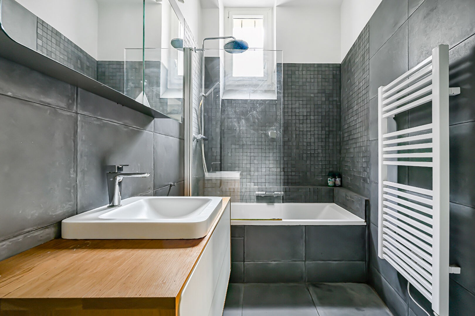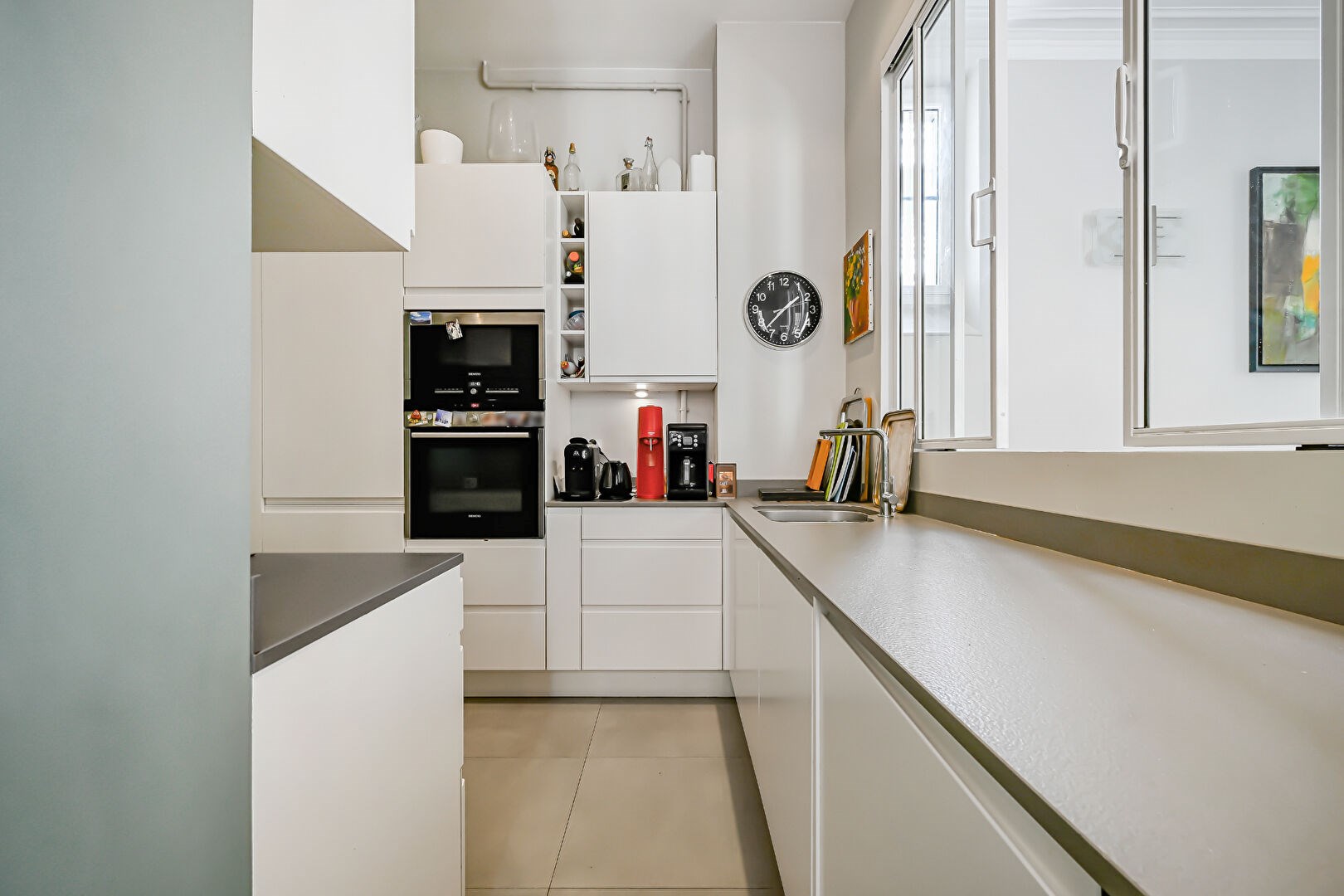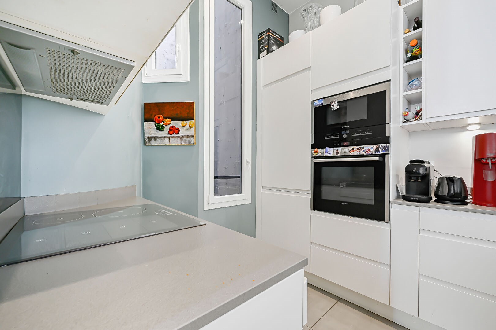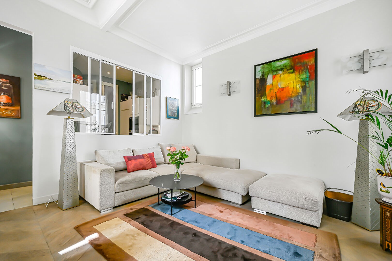 Parquet point de Hongrie, 3, 30 mètres de hauteur sous plafond. Charme de l'ancien (moulures, cheminée). Nombreux rangements sur mesure.