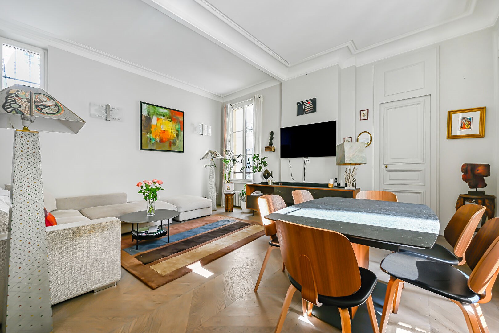 Appartement de standing d'environ 90 m2 de quatre pièces situé au 2ème étage d'un immeuble haussmannien.