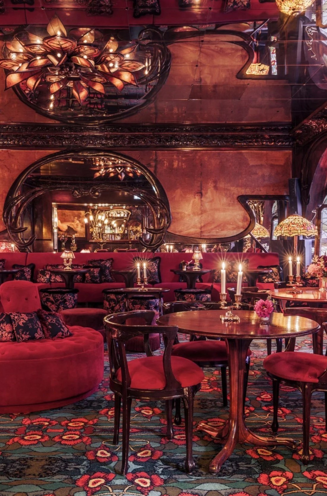 Tandis que BeauCoco Paris installe le décor flamboyant de Corinne Sachot sous les voûtes de l’opéra Garnier, faisant revivre le Paris des années 30 (palette de couleur en écho au fastueux lieu Napoléon III : bronzes clairs ou soutenus, rouges en dégradés, ocres dorés ; rideaux démesurés ; végétaux exotiques exubérants), le restaurant Baronne plonge les convives au coeur de l’univers extraordinaire, de l’hôtel Salomon de Rothschild. A deux pas des Champs-Elysées, cette « folie » du 19ème siècle illustre le remarquable travail de Corinne Sachot et met en lumière le savoir-faire d’artisans d’exception. S’inspirant des salons richement décorés de la Baronne Adèle, à qui elle rend hommage, elle habille les immenses fenêtres de rideaux en velours gaufrés, réalisés par la manufacture royale Bonvallet. Aux murs, les tentures rares de Mariano Fortuny, aux couleurs de la nature, réchauffent l’atmosphère. Le mobilier, composé de banquettes et de chauffeuses confortables en velours, s’accorde parfaitement avec le comptoir en marbre habillé de cuir tressé de l’atelier Mériguet-Carrère